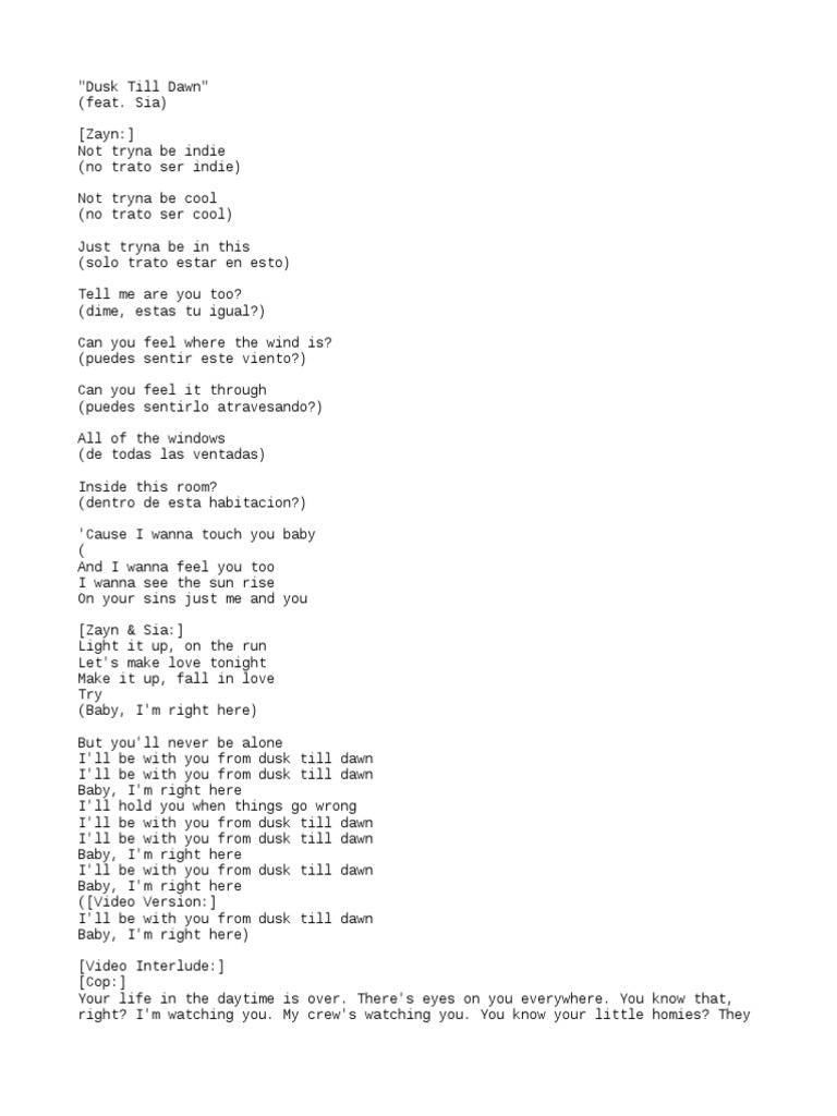 Baby Im Right Here I'll Be With You From Dusk Till Dawn / Zayn] not tryna be indie not tryna be cool just tryna be in this tell me, are you too?