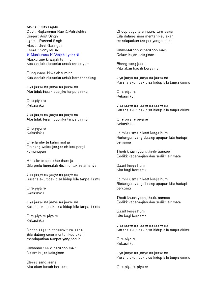 Lirik Lagu Muskurane Indonesia / Lagu ini dinyanyikan oleh arijit singh dan lirik lagu ditulis oleh rashmi singh.