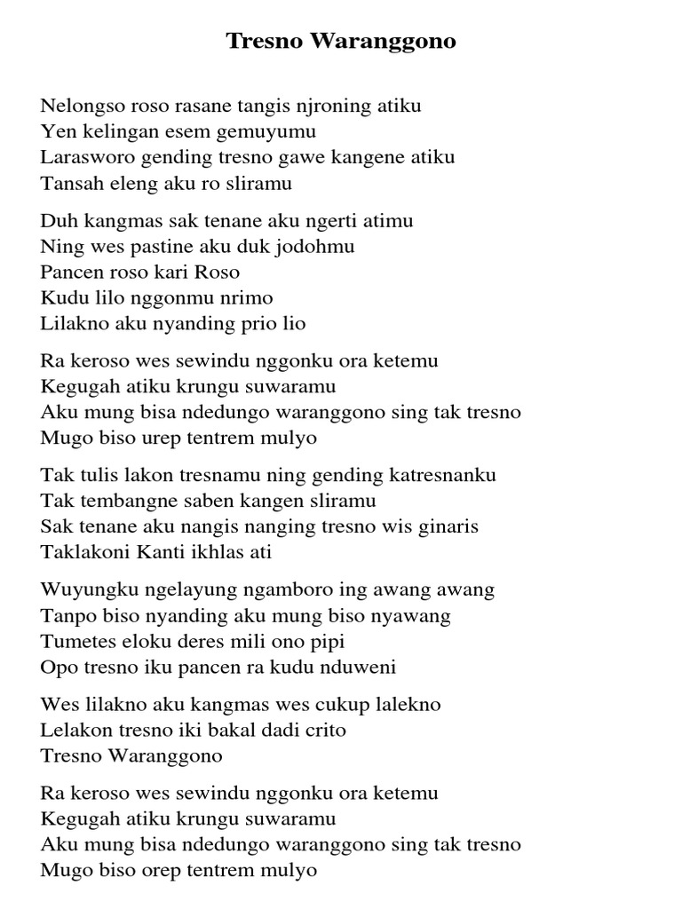 Lirik Tresno Waranggono - Wes lilakno aku kangmas wes cukup lalekno lelakon tresno iki bakal dadi crito tresno waranggono.