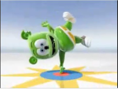 Osito Gominola Yo Soy Tu Gominola / Ella tiene una remera azul con un buzo azul con orejas de oso, zapatillas amarillas y pantalones grises.